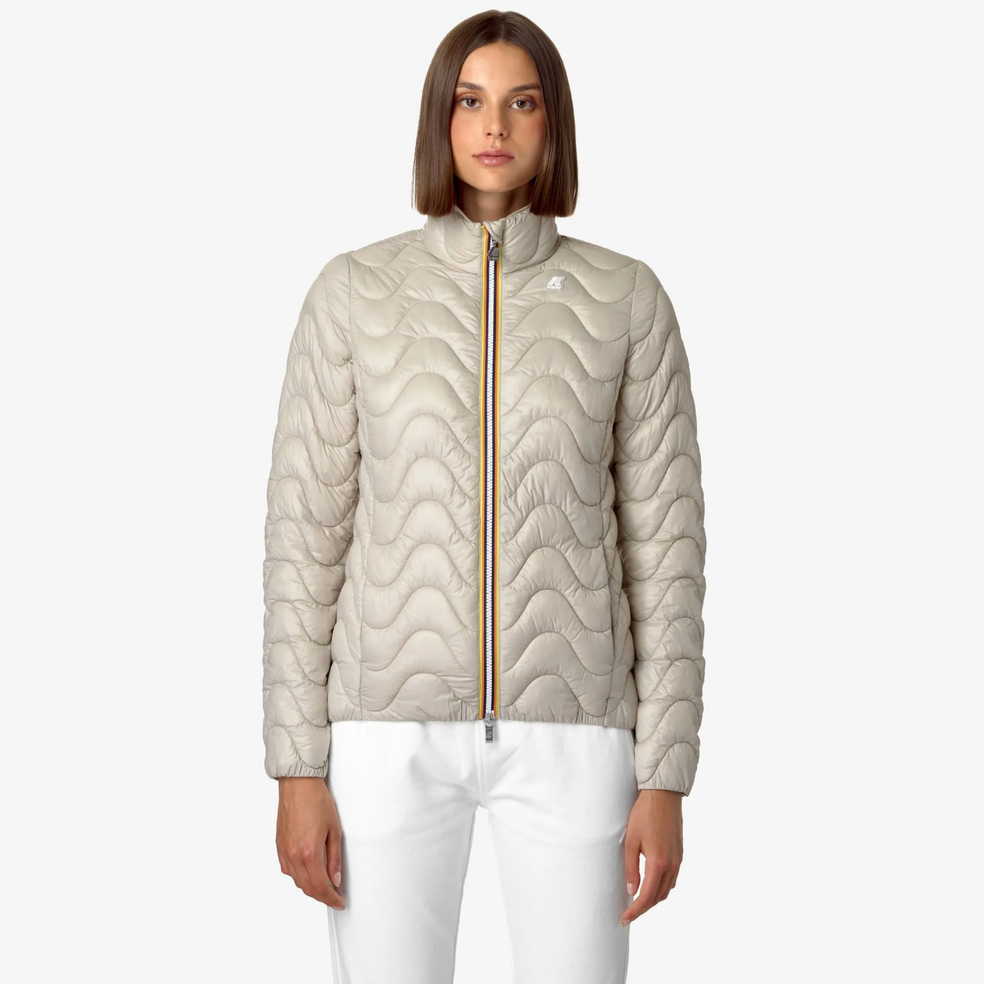 Violette è la giacca corta da donna che si caratterizza per la linea slim che valorizza la silhouette. Realizzata in nylon riciclato che protegge dall’acqua e dal vento, ha una trapuntatura a onde dall’effetto grafico distintivo. L’aspetto innovativo è l’imbottitura in Thermore®, una fibra ottenuta dalla plastica riciclata e altamente isolante.