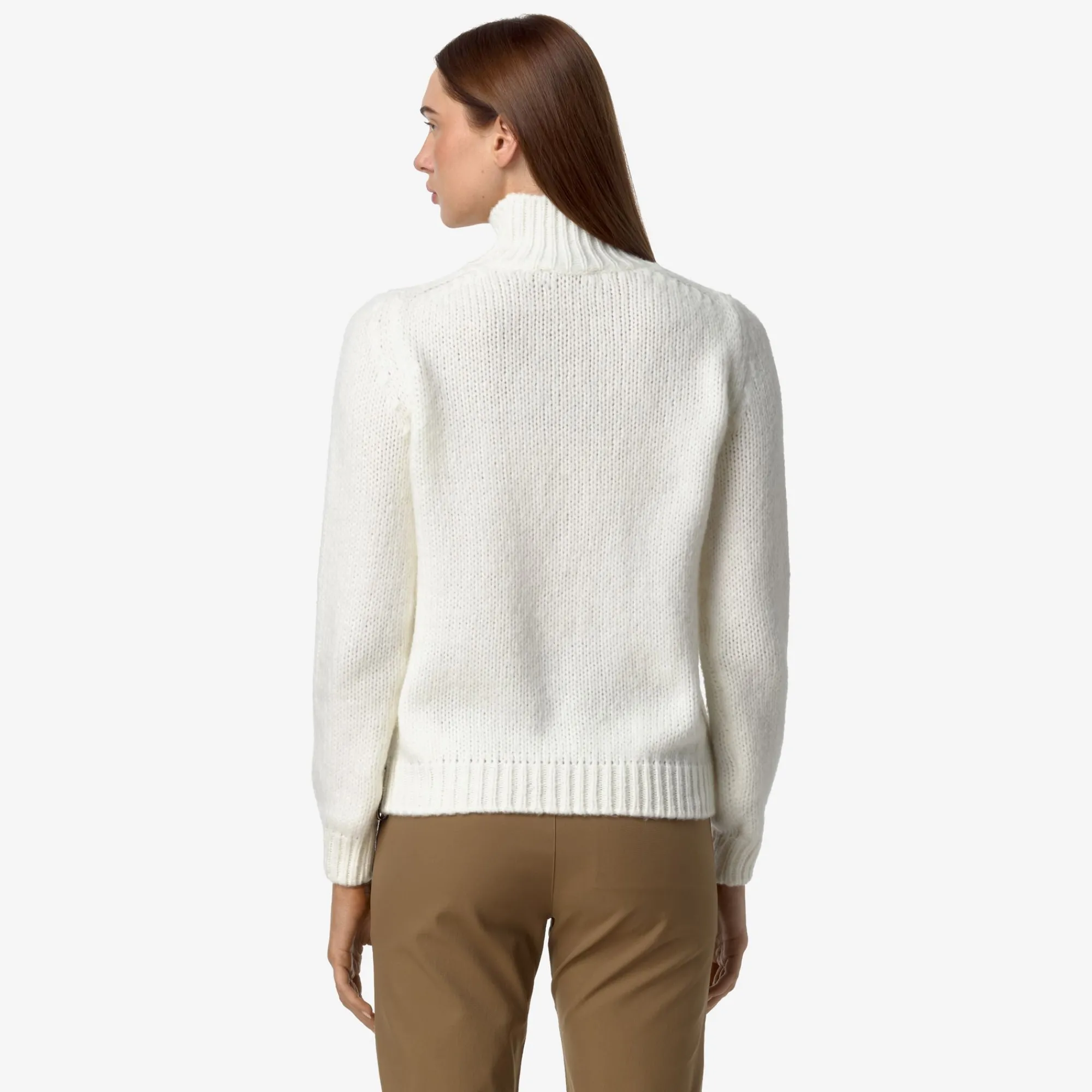 Fuzzy è un pullover a collo alto da donna dal look raffinato, accogliente e contemporaneo, ideale per l’utilizzo in occasioni casual e più formali, realizzato con un pregiato filato misto lana merino piacevolmente caldo, corposo e avvolgente e con un motivo a treccia sul fronte. Il modello presenta vestibilità regolare, collo e bordi a costine e il dettaglio del logo K-Way sul fianco.