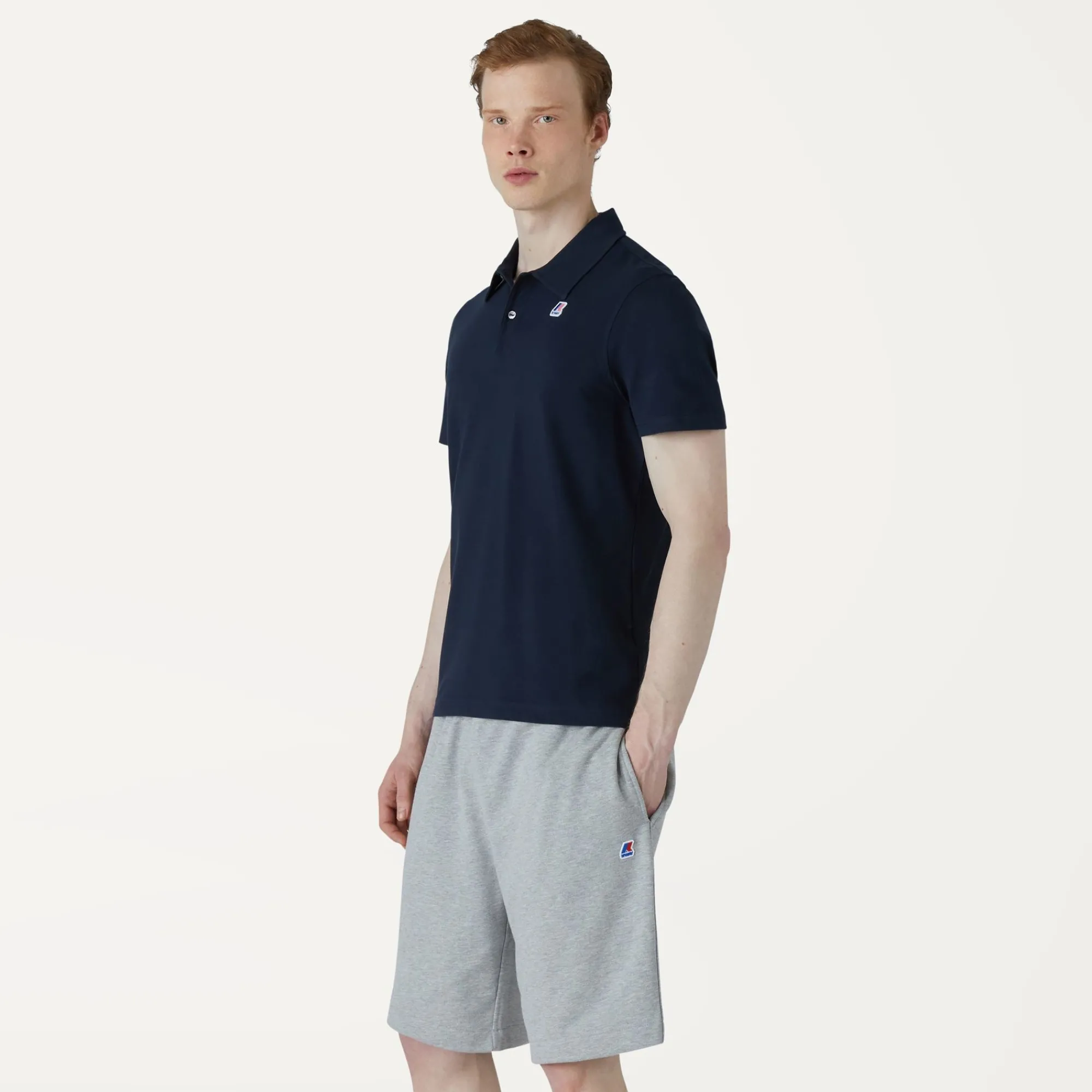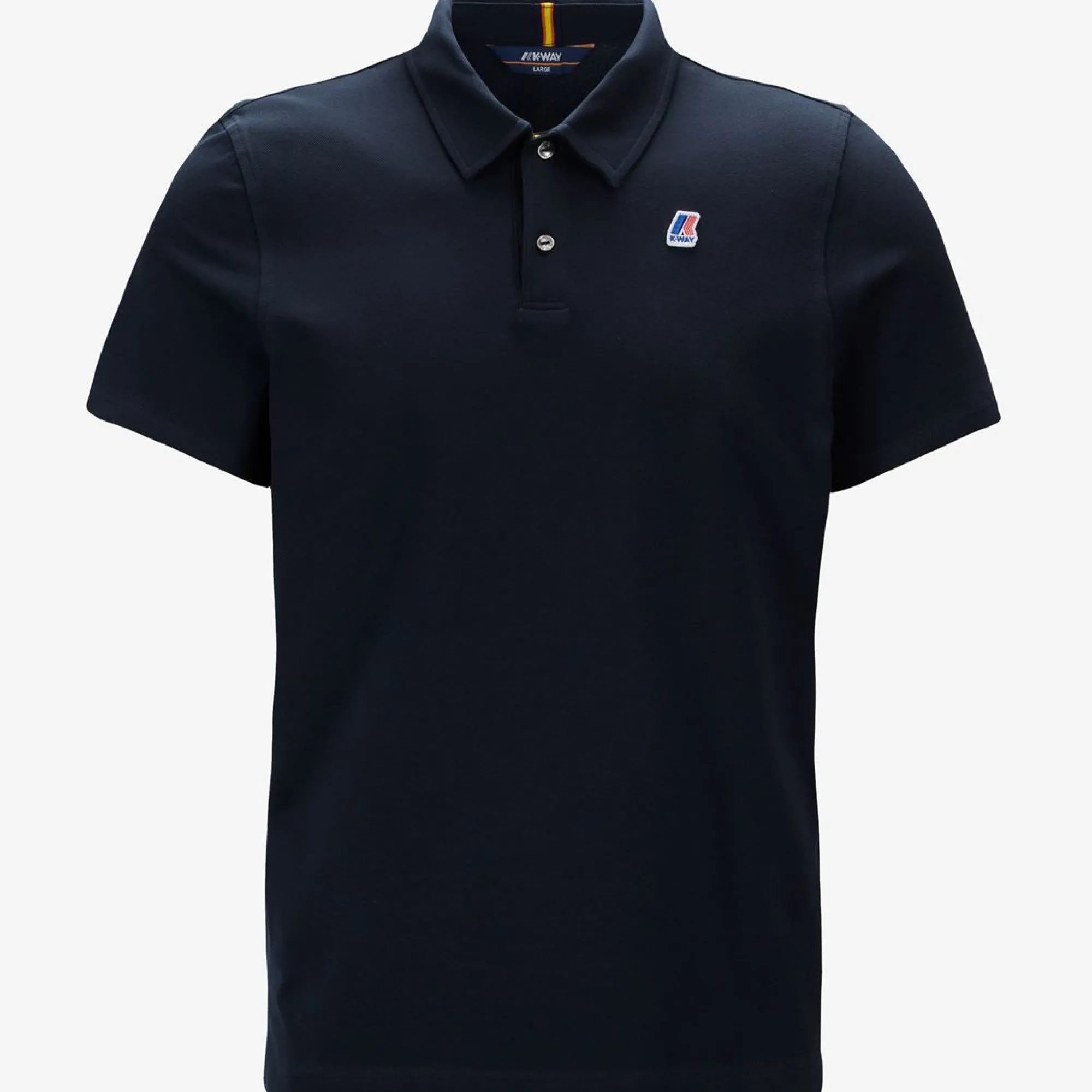 Polo da uomo manica corta a vestibilità attillata. Il capo è realizzato in tessuto piqué stretch 95% cotone 5% elastan. Il collo è dotato di un listino in tessuto anti sudore. I bottoni sono in madreperla, cuciti su micro-tape K-Way. Il capo presenta inoltre due spacchetti laterali per una vestibilità più comoda. Il logo K-Way è ricamato sul fronte. QR label interna ed etichette stampate.