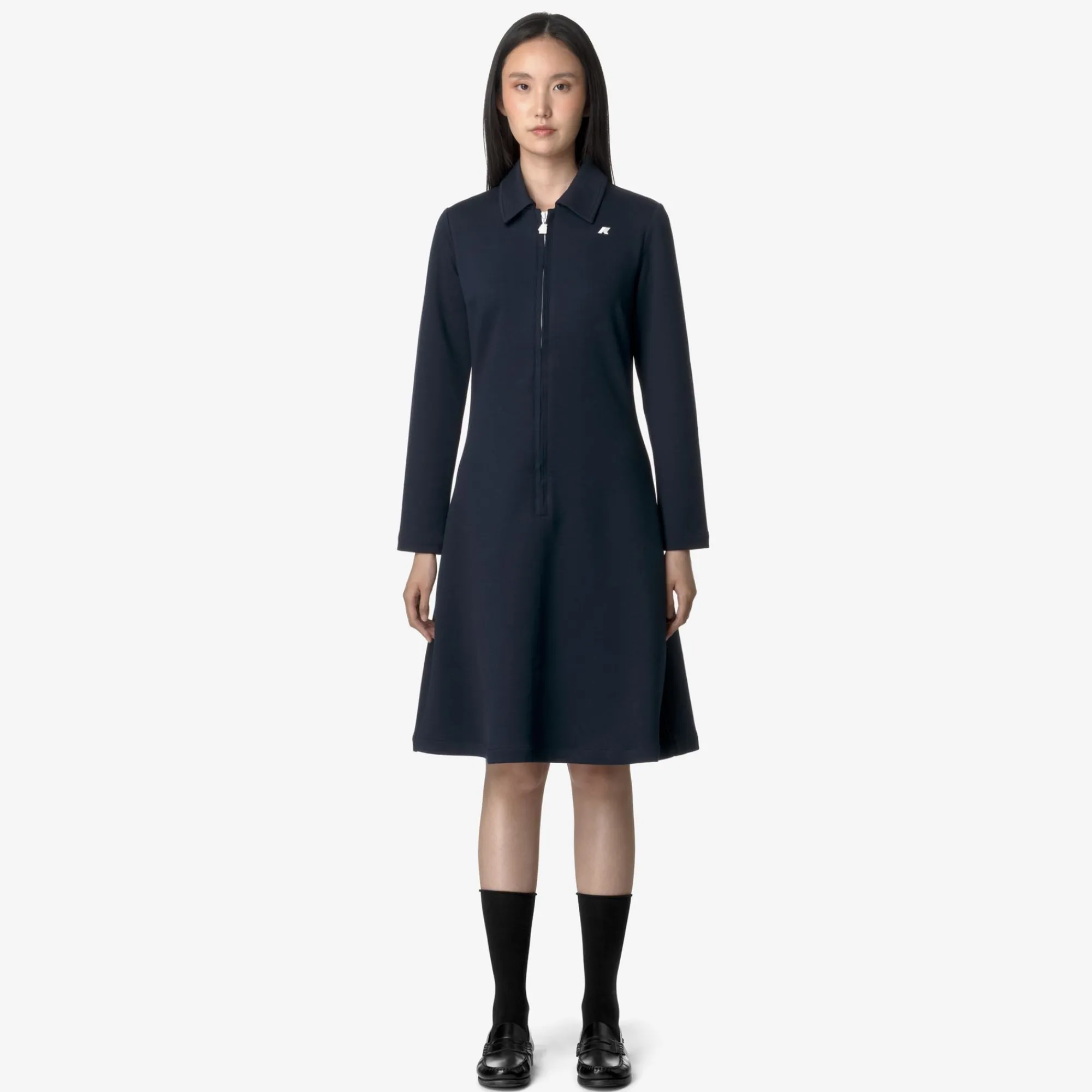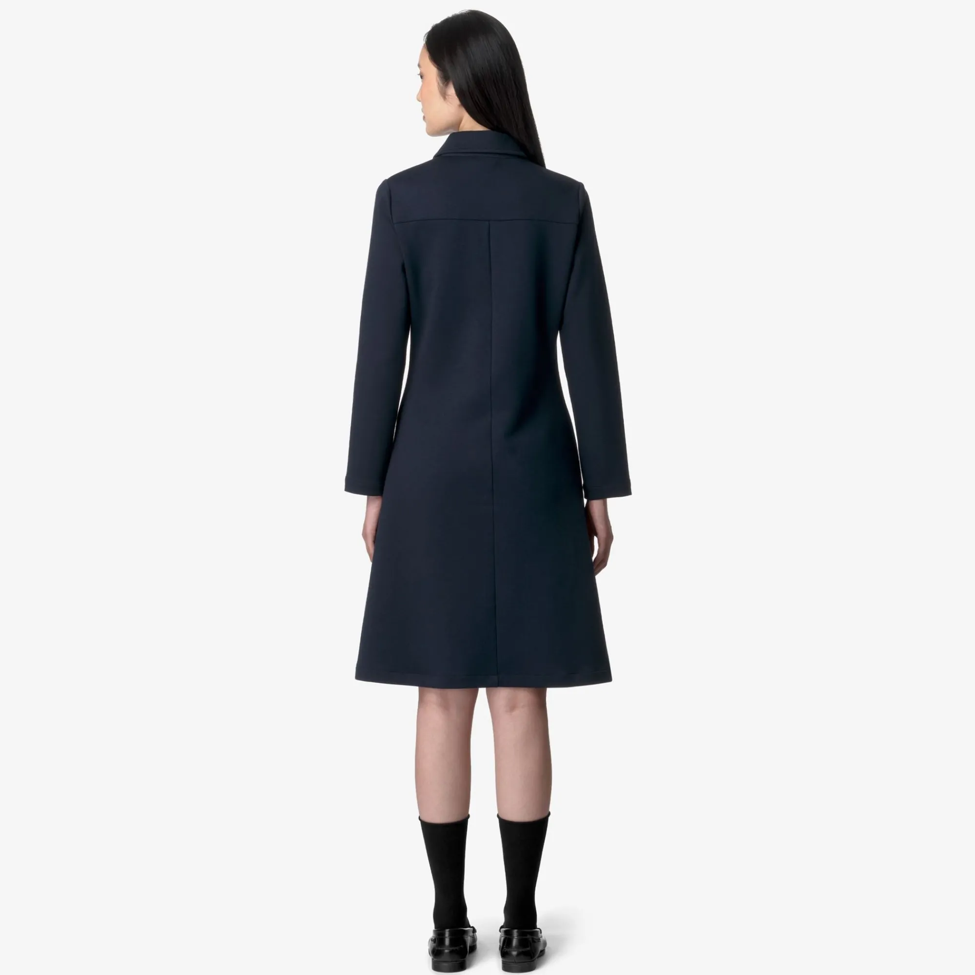 Adelie è un abito di lunghezza 7/8 pensato per le occasioni leisure. Realizzato in interlock tecnico dalla mano liscia e morbida, un materiale caldo e flessibile che offre comfort e libertà di movimento, si caratterizza per la sua linea femminile svasata che segue delicatamente la silhouette con una vestibilità aderente.
