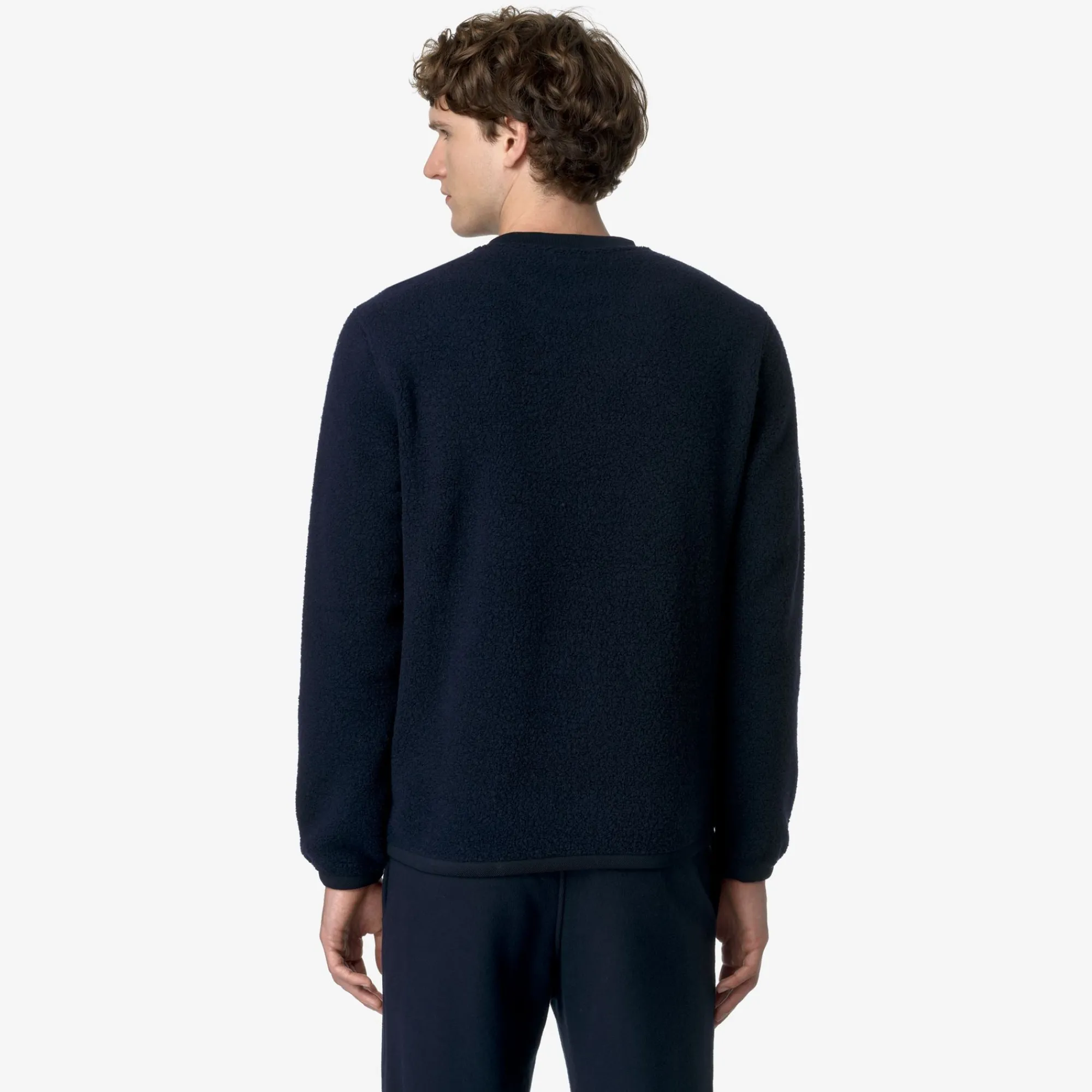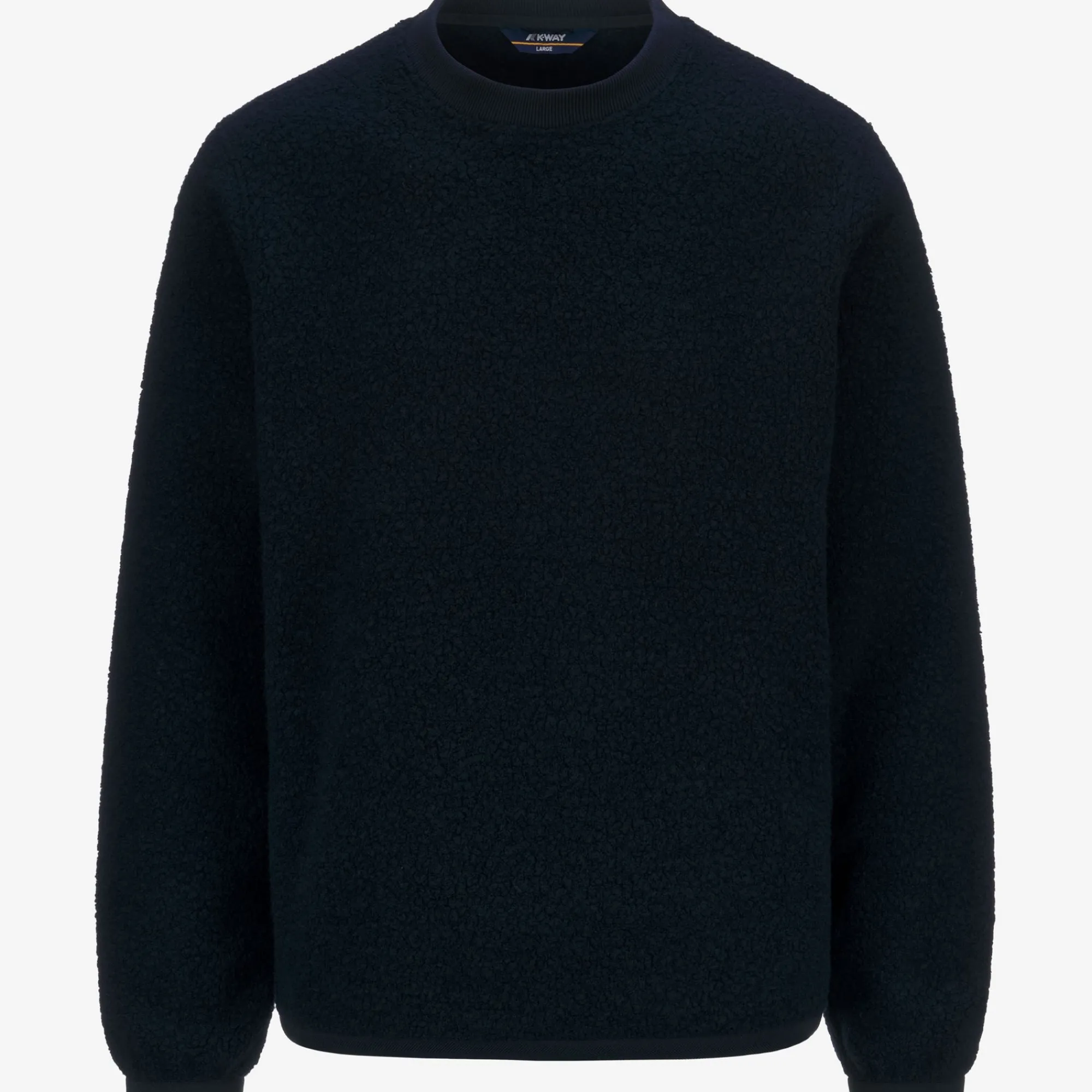 Eround è un pullover da uomo dal look caldo, morbido e accogliente ideale per le occasioni leisure, realizzato con un tessuto orsetto misto lana riciclato. Il modello, dalle linee essenziali, presenta vestibilità regolare, con polsini elastici, girocollo in costina e il dettaglio del tape nei colori iconici K-Way sul fianco.