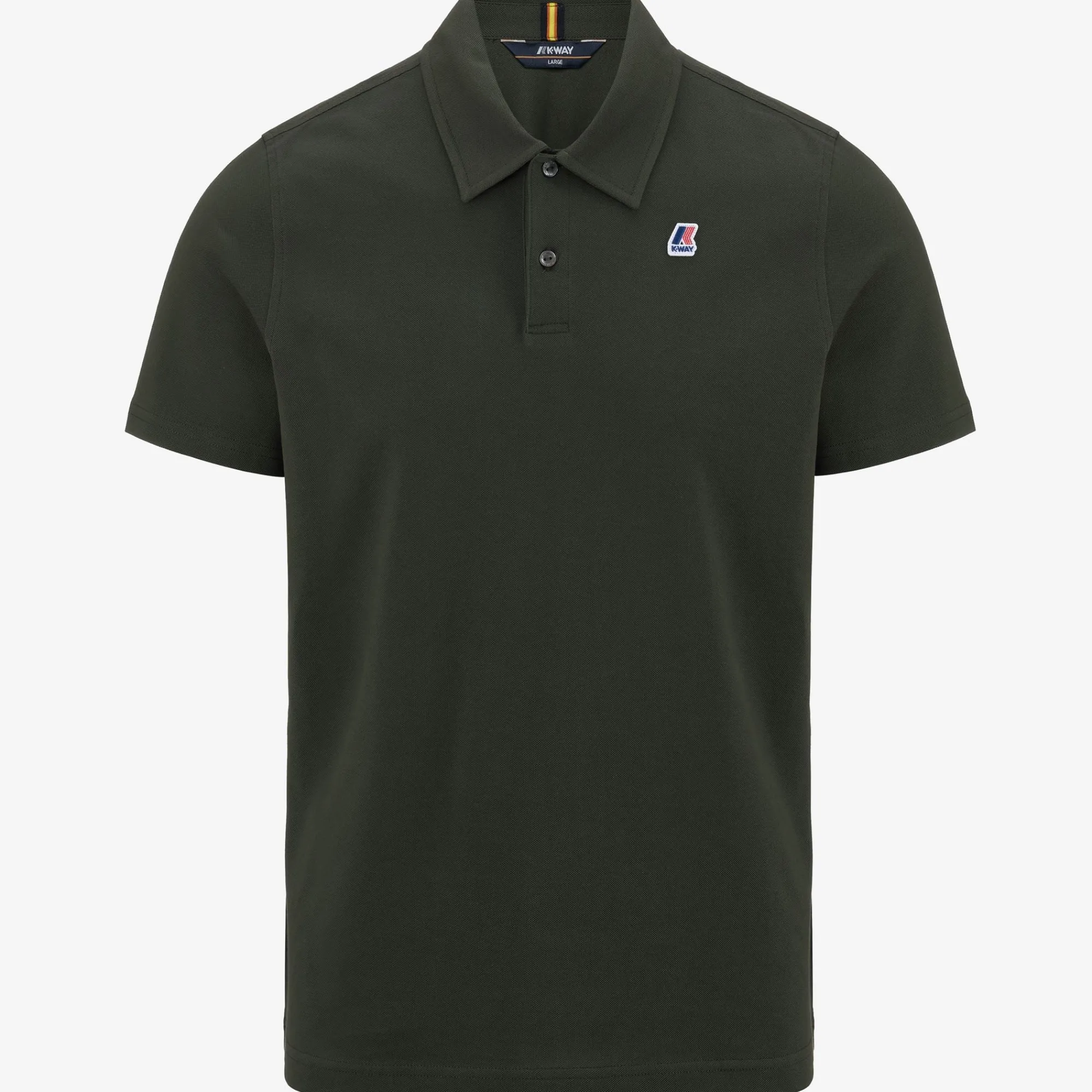 Polo da uomo manica corta a vestibilità attillata. Il capo è realizzato in tessuto piqué stretch 95% cotone 5% elastan. Il collo è dotato di un listino in tessuto anti sudore. I bottoni sono in madreperla, cuciti su micro-tape K-Way. Il capo presenta inoltre due spacchetti laterali per una vestibilità più comoda. Il logo K-Way è ricamato sul fronte. QR label interna ed etichette stampate.