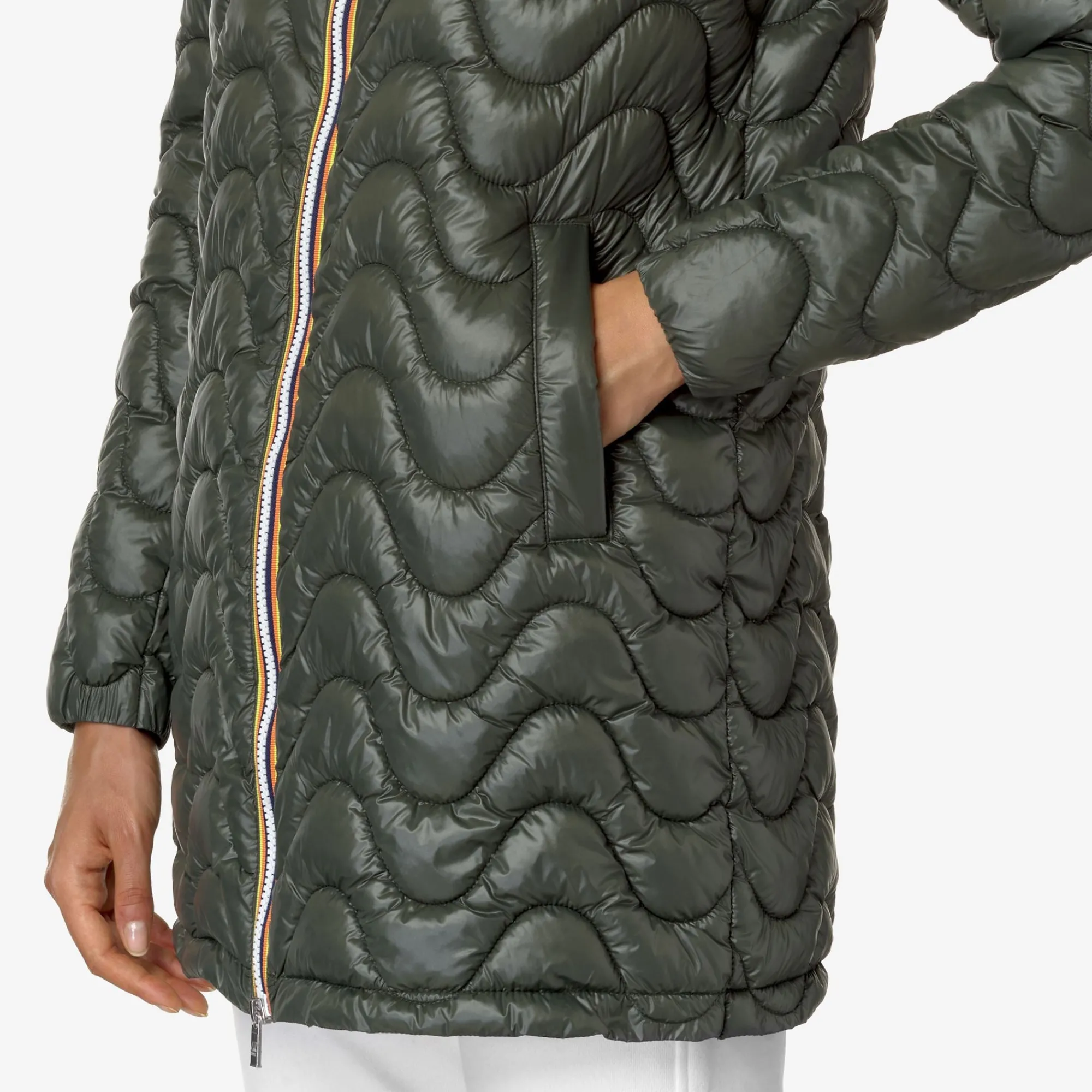 Sophie è la giacca da donna che si caratterizza per la lunghezza media e la linea slim che valorizza la silhouette. Realizzata in nylon riciclato che protegge dall’acqua e dal vento, ha una trapuntatura a onde dall’effetto grafico distintivo. L’aspetto innovativo è l’imbottitura in Thermore®, una fibra ottenuta dalla plastica riciclata e altamente isolante.