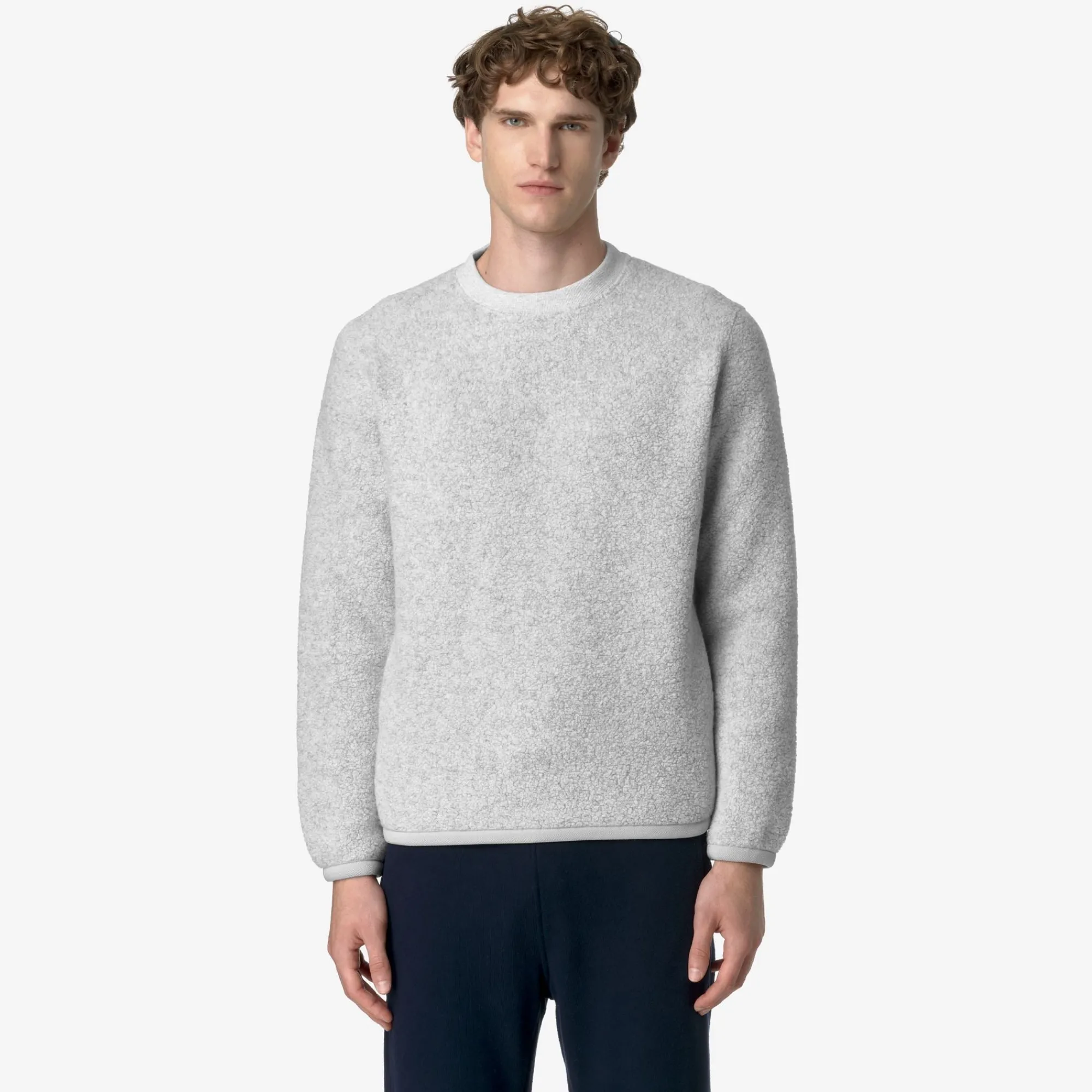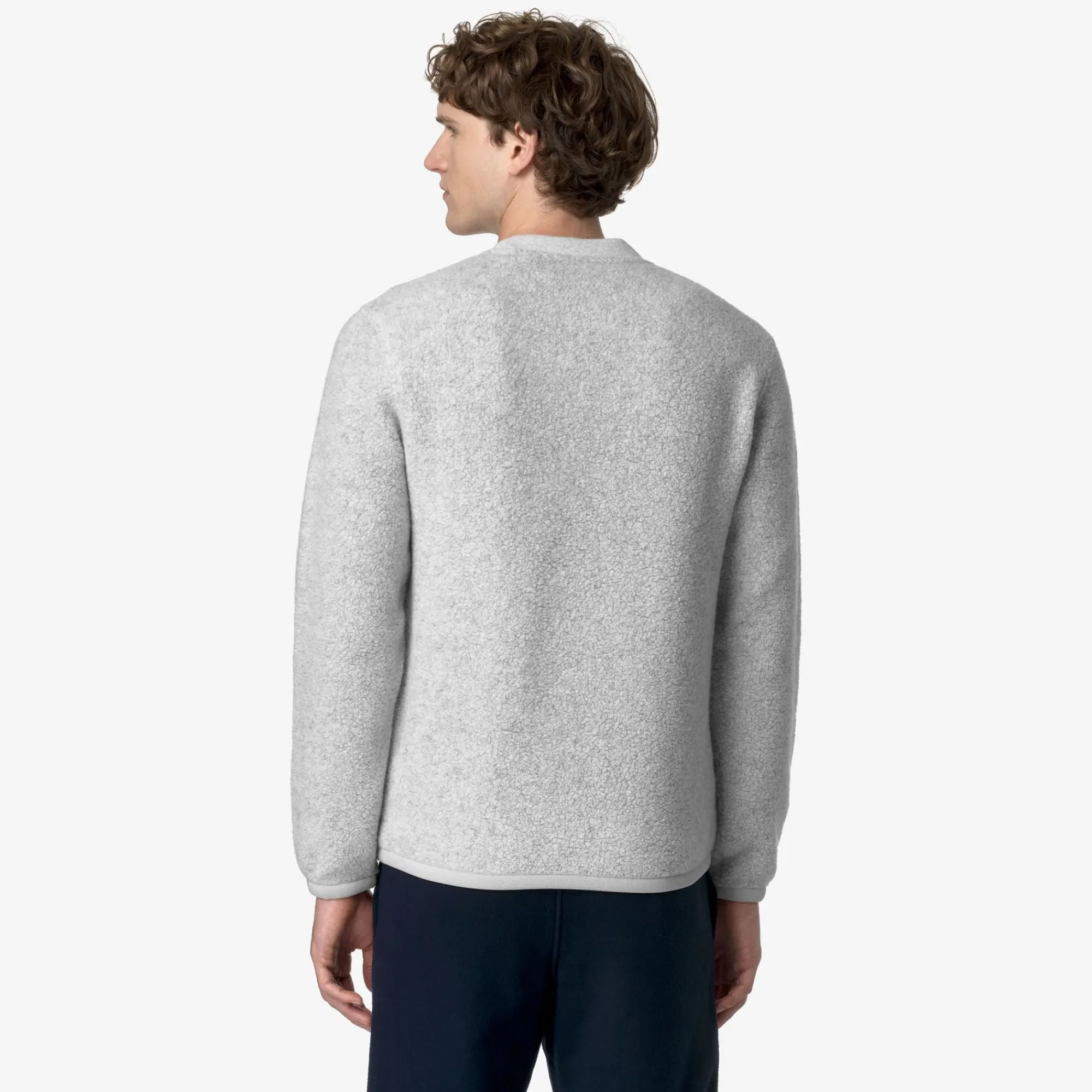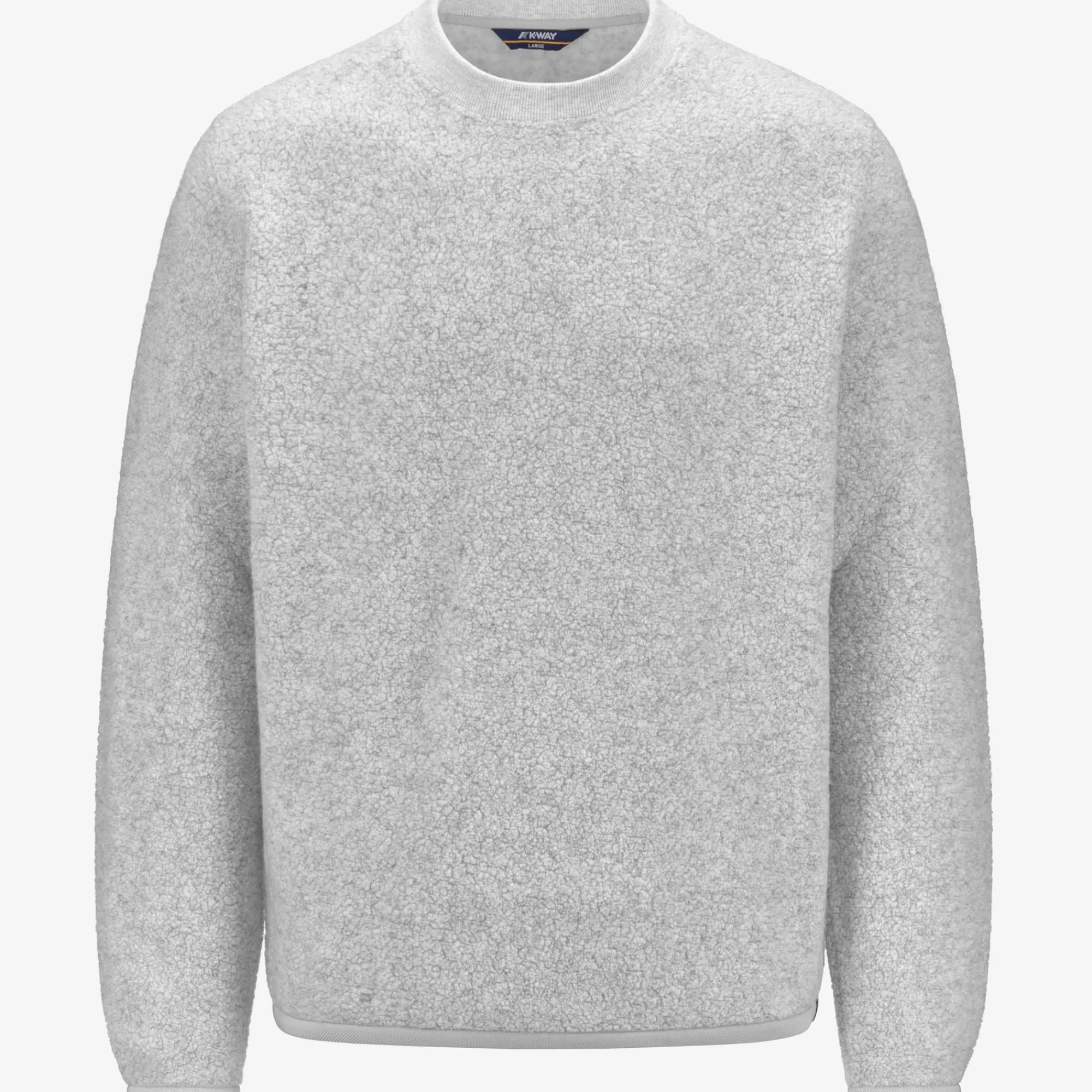 Eround è un pullover da uomo dal look caldo, morbido e accogliente ideale per le occasioni leisure, realizzato con un tessuto orsetto misto lana riciclato. Il modello, dalle linee essenziali, presenta vestibilità regolare, con polsini elastici, girocollo in costina e il dettaglio del tape nei colori iconici K-Way sul fianco.