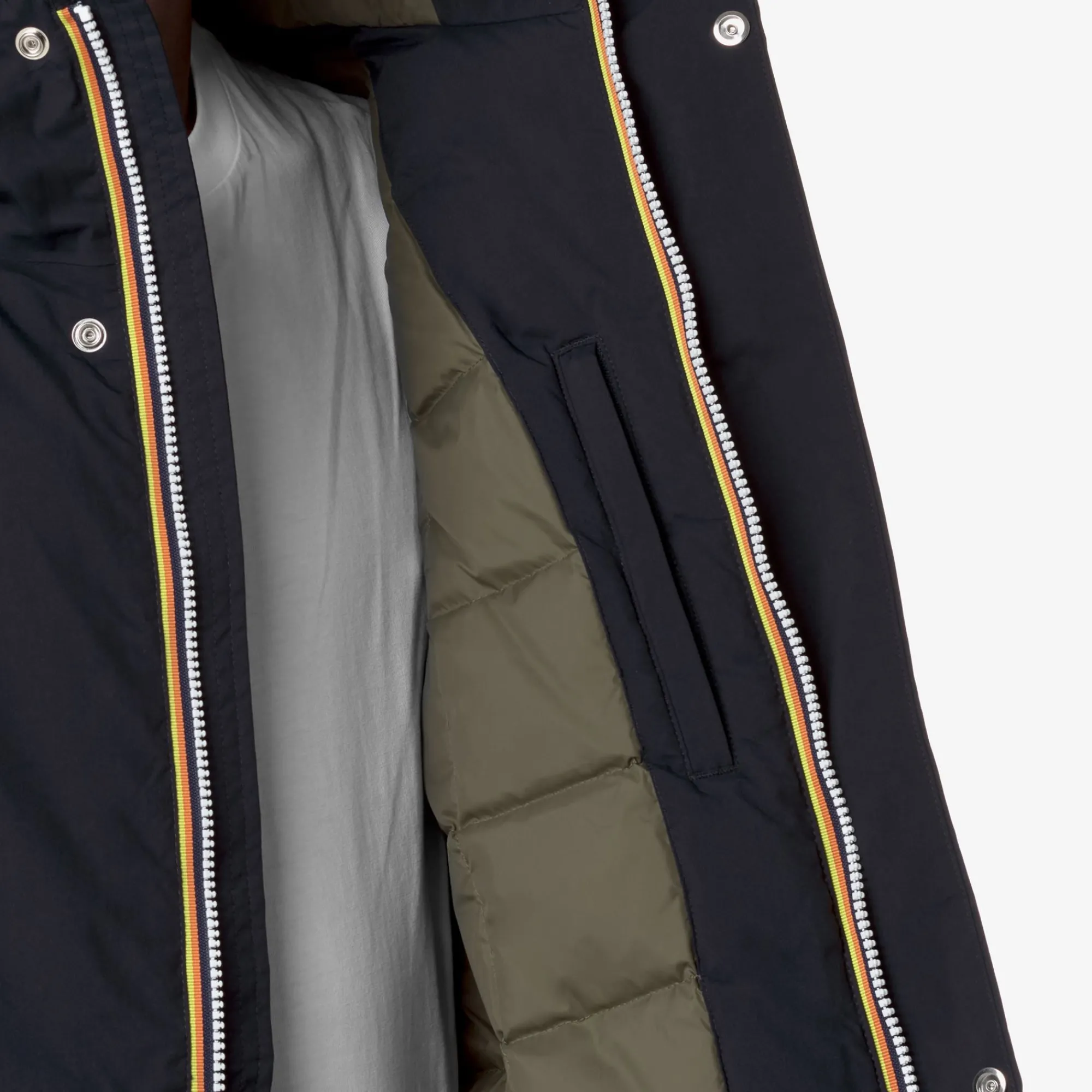 - Tessuto nylon trapuntato antivento, traspirante, con tenuta piuma