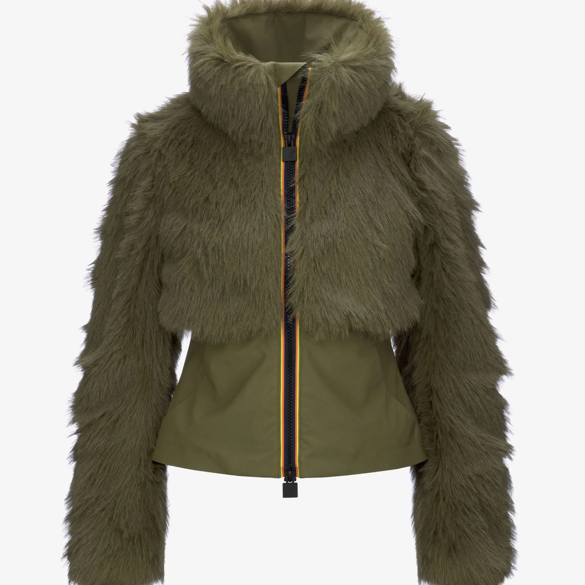 Mel è una giacca corta da donna che combina faux fur e tessuto tecnico in modo eclettico e contemporaneo, con una costruzione funzionale e un fit aderente che esalta la silhouette: la parte superiore della giacca è realizzata in pelliccia sintetica, mentre la parte inferiore è realizzata in tessuto tecnico a 3 strati con esterno idrorepellente e antivento e un’imbottitura in cascami di cashmere provenienti da scarti di produzione per garantire un comfort e una protezione elevati. Il capo presenta chiusura full zip nei colori iconici del tape K-Way.