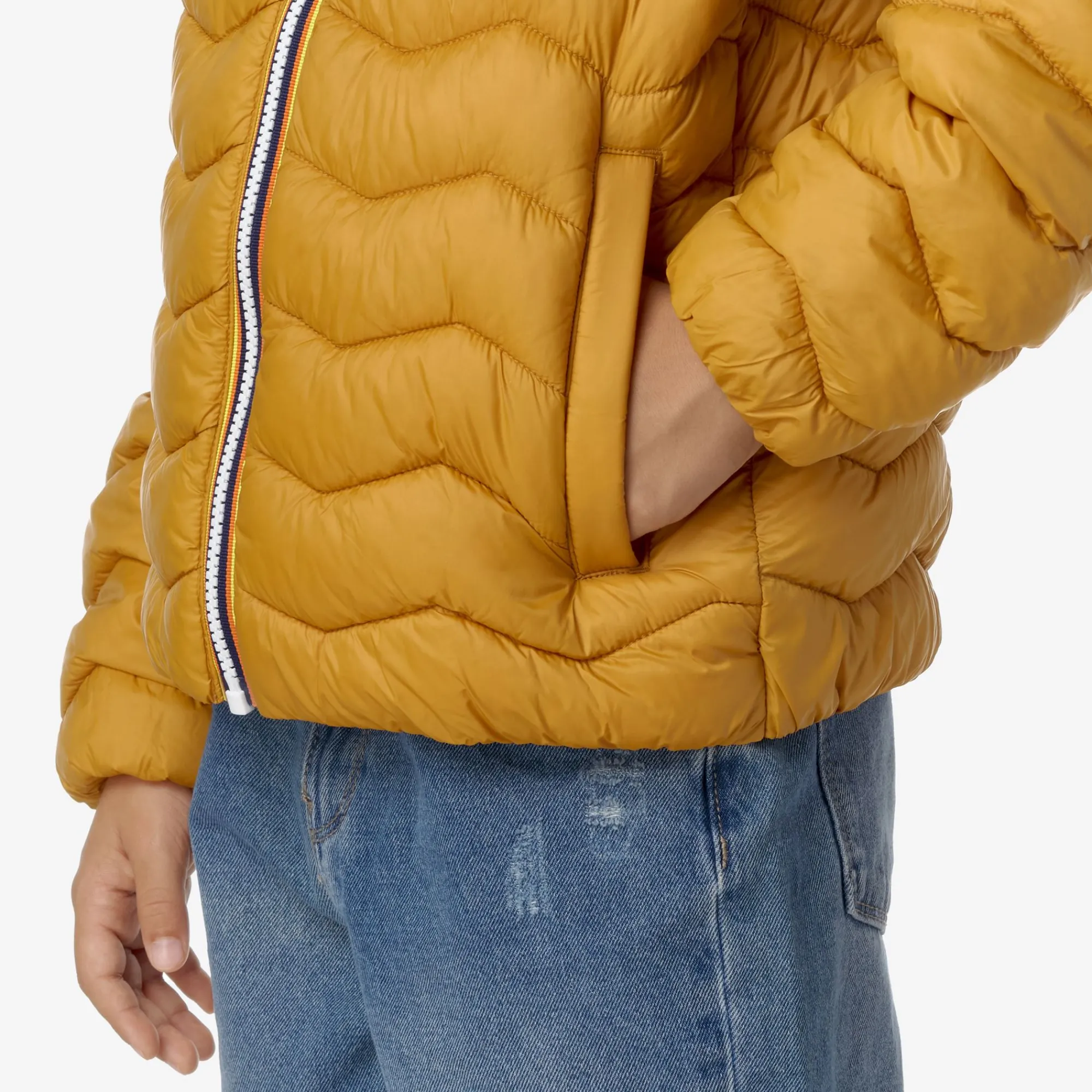 Jack è la giacca da bambino K-Way che dimostra l’impegno del brand per il rispetto della natura. Realizzato in nylon riciclato che protegge dall’acqua e dal vento, ha una trapuntatura a onde dall’effetto grafico distintivo. L’aspetto innovativo è l’imbottitura in Thermore®, una fibra ottenuta dalla plastica riciclata e altamente isolante.