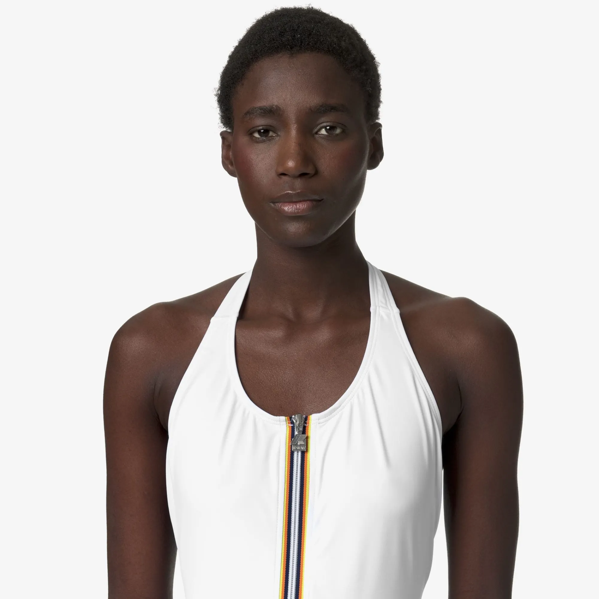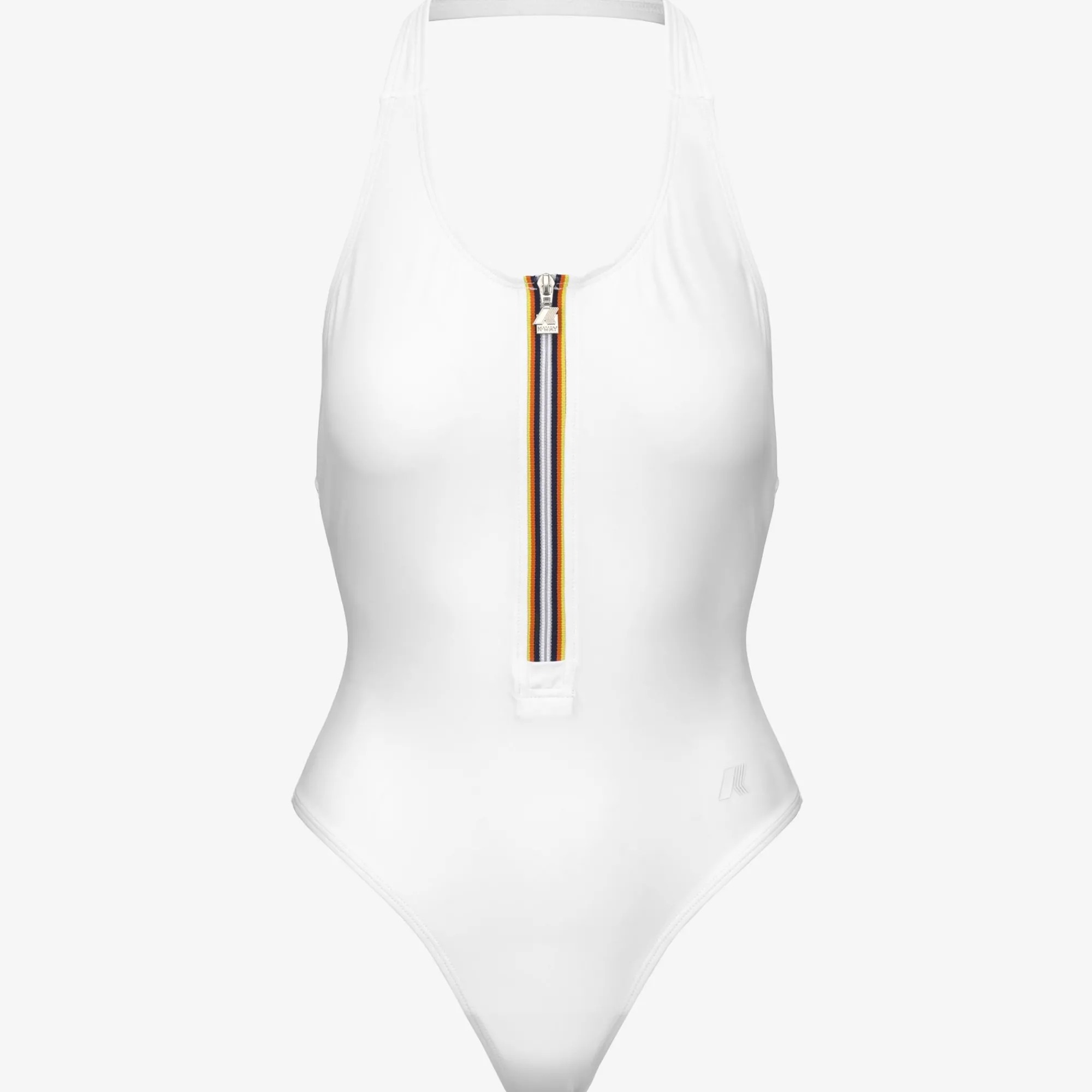 Il costume intero Sylvie ha una linea slanciata e femminile con scollatura all’americana e lunga zip sul davanti decorata con l’iconico tape multicolor. Realizzato in Lycra® resistente e ad asciugatura rapida, con il logo K-Way bianco sul fianco che aggiunge un dettaglio grafico elegante.