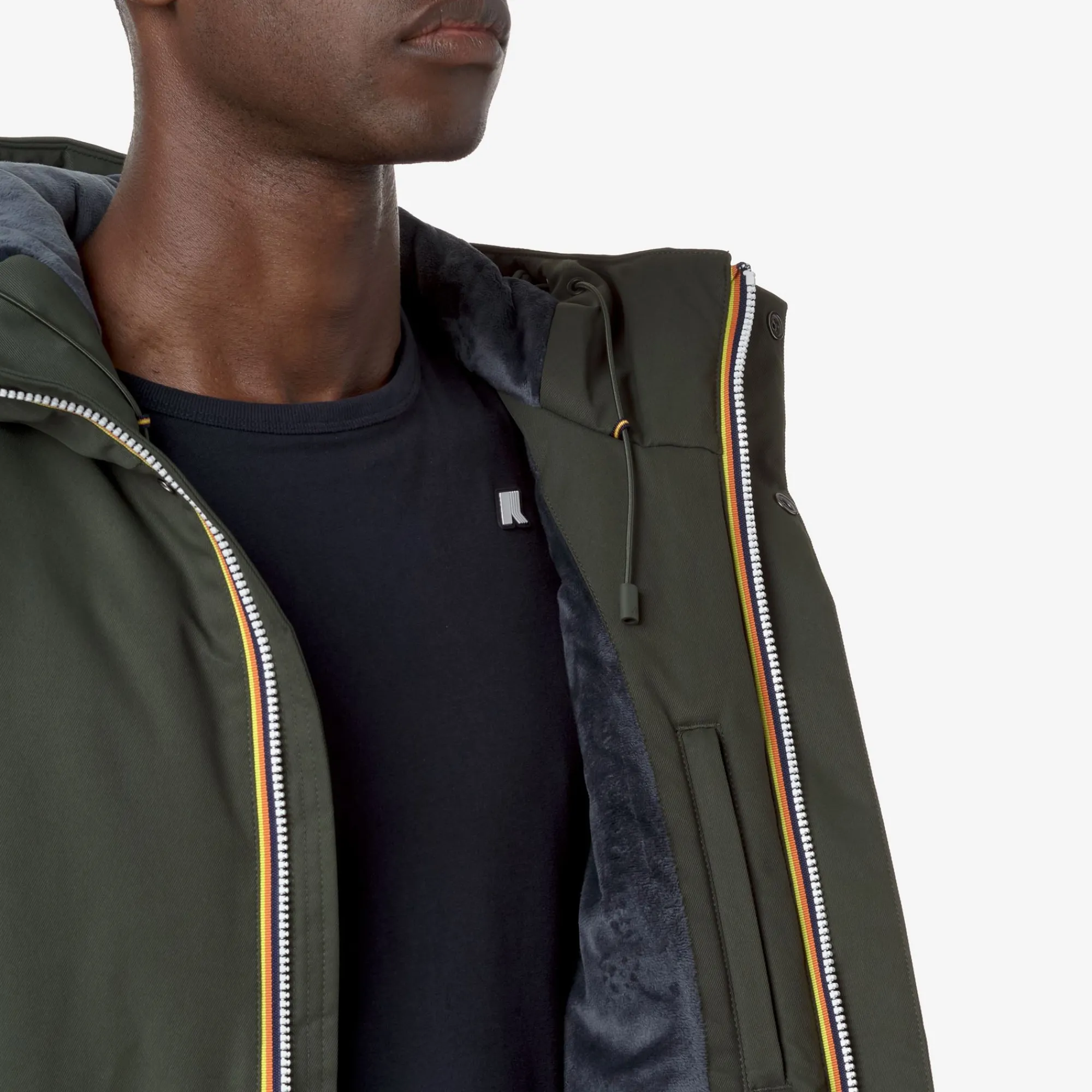 - Cappuccio non staccabile regolabile con corda elastica e fermacorda